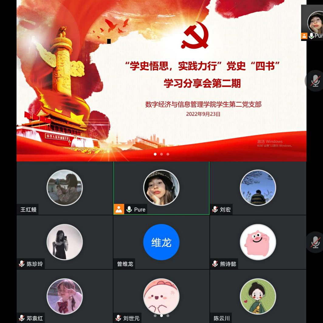 2022年9月22日,数字经济与信息管理学院学生第二党支部组织“学史悟思,实践力行”党史“四书”第二期学习分享会。分享会通过腾讯会议APP进行,会议由刘琳老师主持,数字经济与信息管理学院学生第二党支部全体党员参加会议。