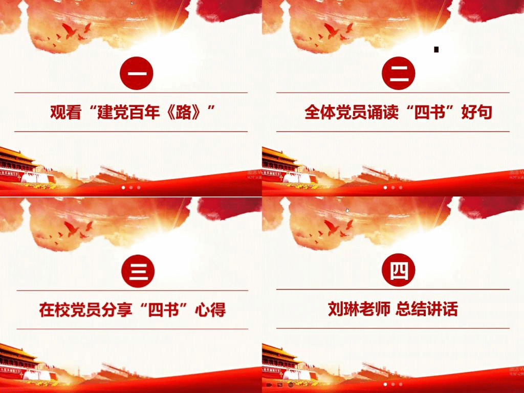 此次分享会共分为四个部分,第一部分是观看视频“建党百年《路》”,记录了从1921年中国共产党成立至2021年中国共产党成立一百周年以来中国发生的重大事件,中国共产党一步步走出的历史脉络也走进我们每一位党员的眼里、心里、思想里。第二部分是全体党员诵读“四书”好句,党员们积极分享所看书籍片段,激情昂扬地朗诵出中国历史的印记,刘琳老师针对每位党员的分享进行提炼总结,让党员同志们更好地了解“四书”所述的精神。第三部分是在校党员分享“四书”心得,每位在校党员总结自己所学书中知识,畅谈个人心得体会。第四部分是刘琳老师总结讲话,刘琳老师指出,每位党员应“知党史,明党史”,鼓励党员同志努力学习党史,引导全体党员树立正确的价值观。
