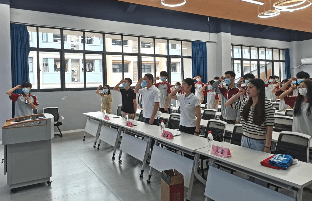 “光荣啊,中国共青团!”结业仪式在慷慨激昂的共青团歌声中拉开序幕。团歌奏毕,主持人带领全体师生重温入团誓词,大家紧握右拳,举齐眉心,目光坚定勇毅,誓词声整齐宏亮,喊出团员初心,呈现了青年的蓬勃朝气,展现出青马工程学员的精神面貌。