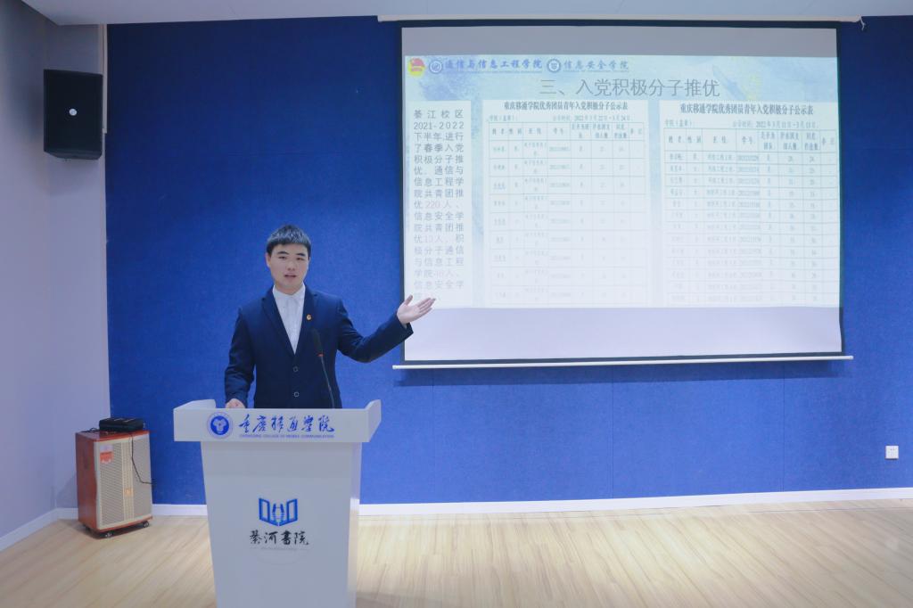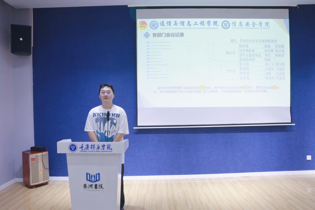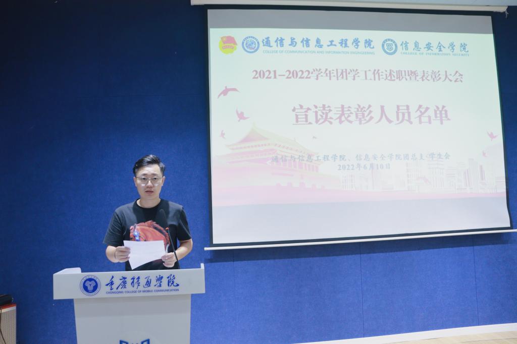 6月10日中午12点40分,重庆移通学院(綦江校区)通信与信息工程学院、信息安全学院2021-2022学年团学工作述职暨表彰大会在綦河书院苍山阶梯教室顺利举行。通信与信息工程学院田海燕、程希、胡戈立,信息安全学院王辅崇老师出席了本次述职暨表彰大会。