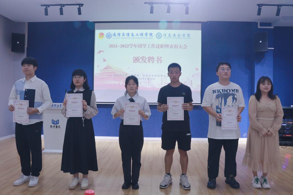 通信与信息工程学院田海燕老师为2021-2022学年团学组织各部门负责人颁发了聘书,并进行了总结讲话。
