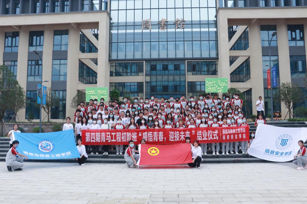 最后在主持人的带领下,师生们共同在图书馆前广场合影留念,同时宣告着本次通信与信息工程学院、信息安全学院青马工程第四期初阶班“感悟未来,迎接未来”结业仪式落下帷幕。