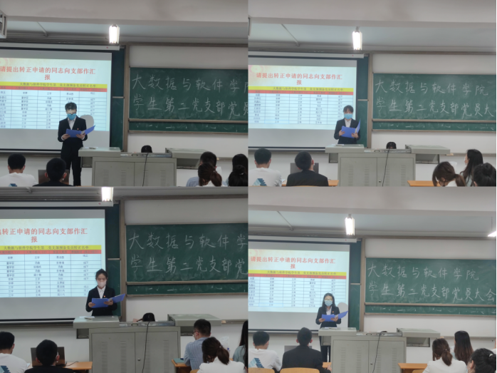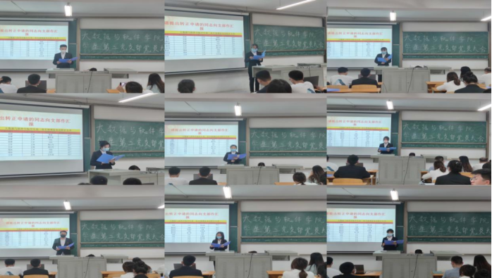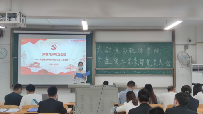 心有所信,方能行远,心中有党,自会砥砺前行。走好新时代的长征路,需要广大党员同志坚定理想信念、坚定政治立场、永葆初心、砥砺前行。新时代的新血液有着顽强的力量,新一代党员同志更是党未来的接班人。为迎接党的新力量,大数据与计算机科学学院学生第一、第二、第三、第四党支部于2022年5月27日下午14:00分别在第一教学楼1301、1302、1309、1310开展了预备党员转正大会,讨论关于陈玉、岳春江等48位同志申请转为正式党员的事宜,出席本次大会的有大数据与计算机科学学院党总支副书记王焱,党总支组织委员童学容,各支部委员以及其他党员同志。