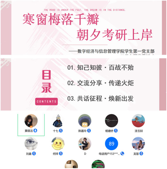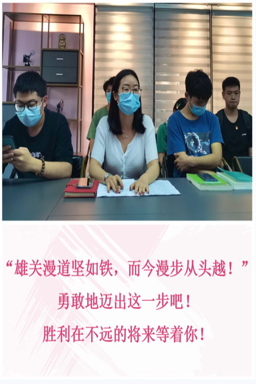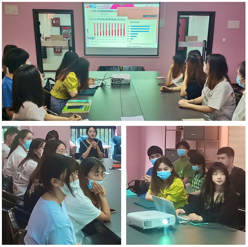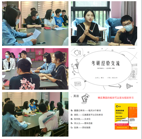“共话旅途新征程,焕然一新再出发”。紧接着,我院成功上岸的黄欣、刘静、钟宁三位优秀党员同志为同学们分享自己考研上岸的所感所悟,所见所得,详细讲解如何抉择考研与工作、如何选取学校和专业等内容,并分享专业方向选择和复试调剂录取等方面经验。与此同时,他们结合自身考研经历,具体讲解在考研过程中可能会遇到的问题,其中包含大家所关心的:考研各科复习方法、学习计划、作息安排、备考心态的调整和相关选择专业的方向以及面试等方面的心得体会等。