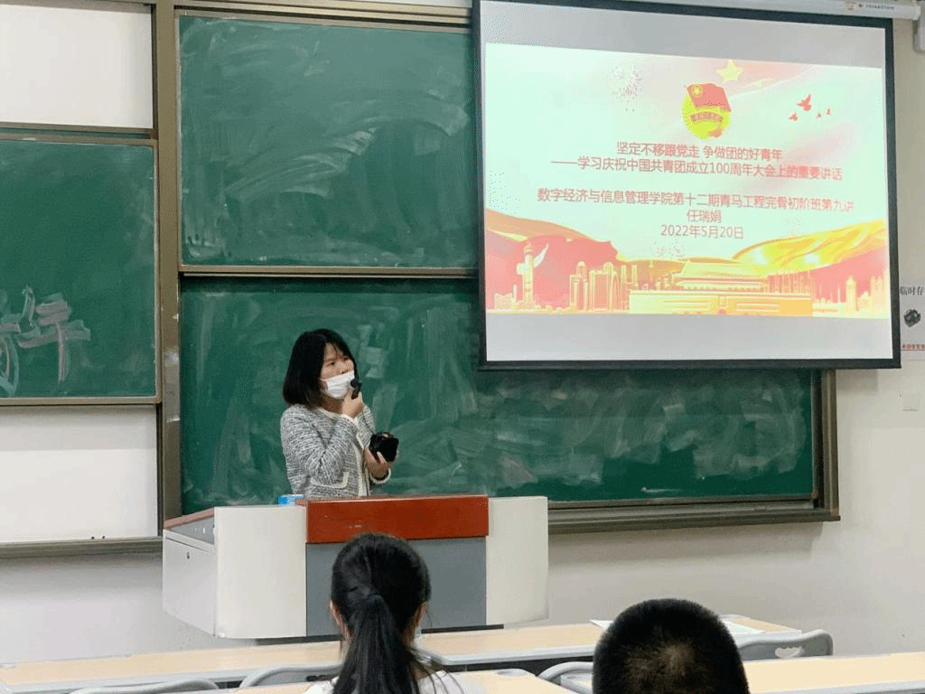 时代召唤青年,青年创造未来。中国共产主义青年团是中国共产党领导的先进青年群众组织,是广大青年在实践中学习中国特色社会主义和共产主义的学校,是中国共产党的助手和后备军。百年来,中国共青团团结带领一代代中国青年奋楫争先,在党的事业和民族复兴征程中,书写了无上的青春荣光。为加强团员对团的归属感,推进团的组织建设,我院于5月27日12:30在双栀书院304教室开展“坚定不移跟党走,争做团的好青年——学习庆祝中国共青团成立100周年大会上的重要讲话”第十二期“青马工程”完骨初阶班“青马”赋能培训第九讲。本讲有幸邀请到数字经济与信息管理学院副院长任瑞娟老师为学员们带来培训。