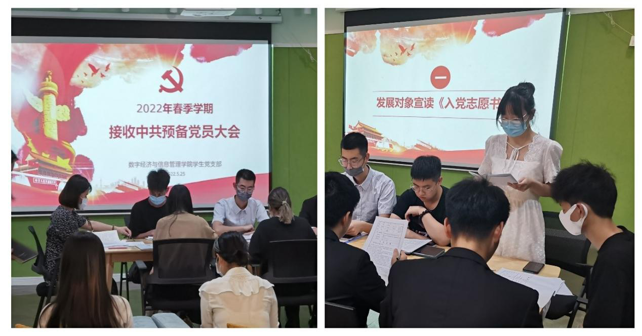 为进一步加强基层党组织建设,注入新鲜血液,数字经济与信息管理学院学生党支部于5月24日15:30及5月25日9:00分两批次在双栀书院多功能影音室召开了接收预备党员大会。本次会议由支部书记任瑞娟同志主持,大会围绕接收刘行、张炼知、王诗语等10名发展对象成为预备党员,并通过大会讨论并决定发展对象的入党问题。