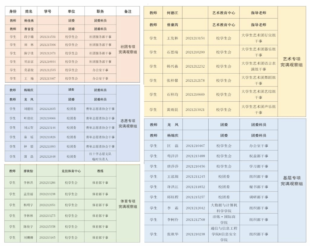 结合我校完满教育方针,为提升完满教育活动质量,多层次多角度的客观公正评价各完满教育工作开展成效,助推完满教育活动品牌化、内涵化、规范化,推动完满教育更稳、更快、更好地开展,綦江校区正式成立校级完满观察团。