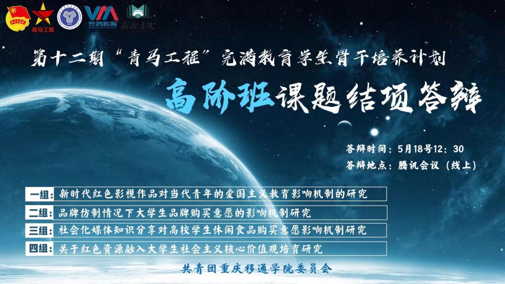 为持续推进我校青马工程建设,进一步增强青马学员理论联系实际、运用马克思主义观点分析和解决问题的能力,提升青马学员的整体素质,第十二期“青马工程”完满教育骨干培养计划高阶班课题结项答辩于2022年5月17日中午午12:30正式举行,此次答辩严格按照疫情防控要求,通过“线上+线下”的方式开展,线下设置候场区和答辩区、对现场进行严格管控。