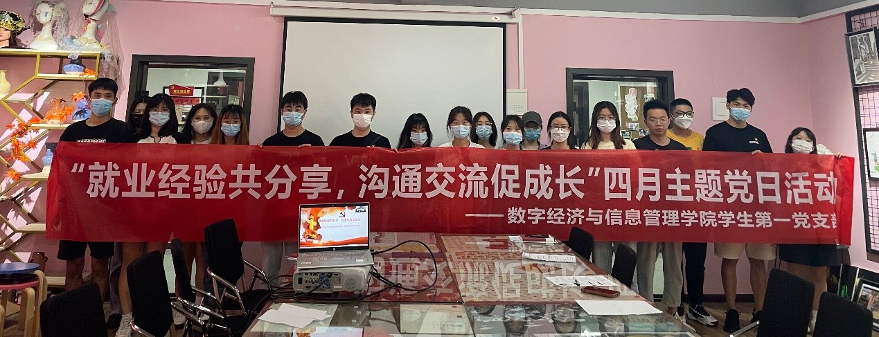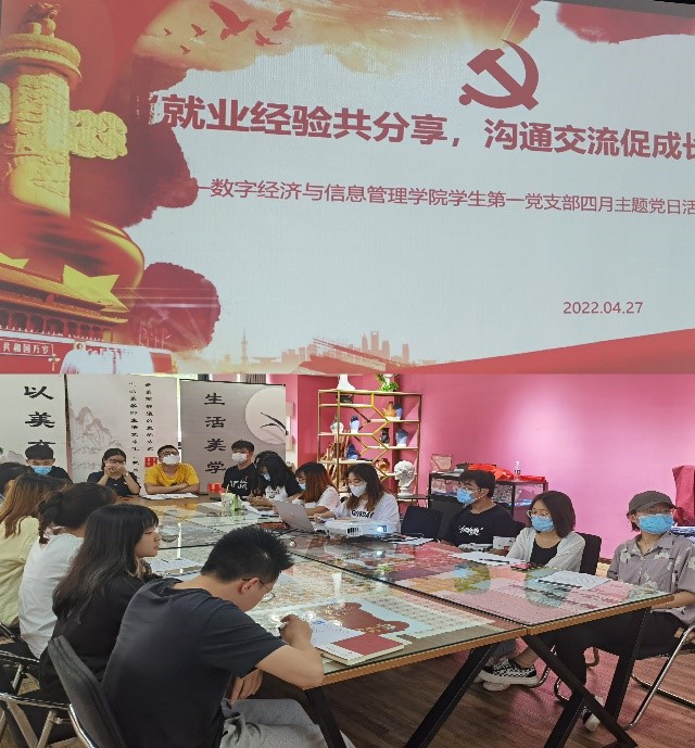 为深入学习《2022届全国普通高校毕业生就业创业工作网络视频会议》精神、贯彻落实党中央、国务院“稳就业”“保就业”决策部署及发挥学生党员在就业方面的示范引领作用,数字经济与信息管理学院学生第一党支部于4月27日16:00在爱莲艺术实践室开展四月主题党日活动,支部全体党员参加。
