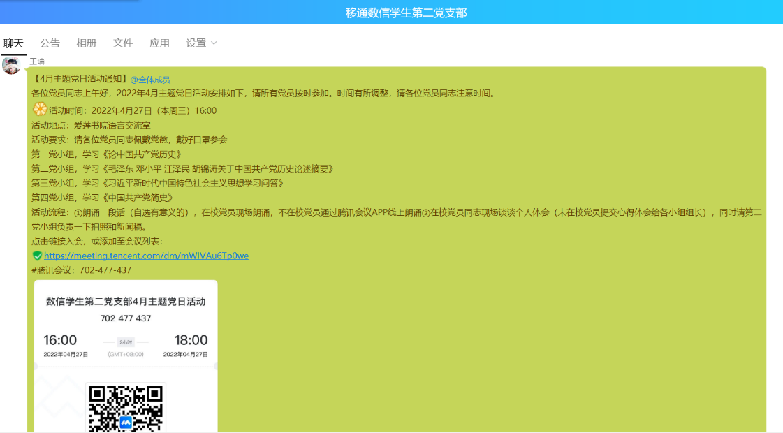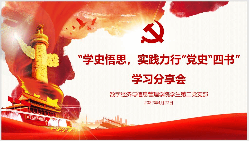 为深入学习和掌握党的历史,矢志践行初心使命,进一步加强师生党员学好党史,深刻地认识红色政权的来之不易、新中国的来之不易、中国特色社会主义的来之不易以及今日幸福生活的来之不易。2022年4月27日,数字经济与信息管理学院学生第二党支部组织开展了“学史悟思,实践力行”党史“四书”学习分享会。分享会在爱莲书院语言交流室举行,会议由支部书记王瑞老师主持,数字经济与信息管理学院学生第二党支部全体党员参加活动。