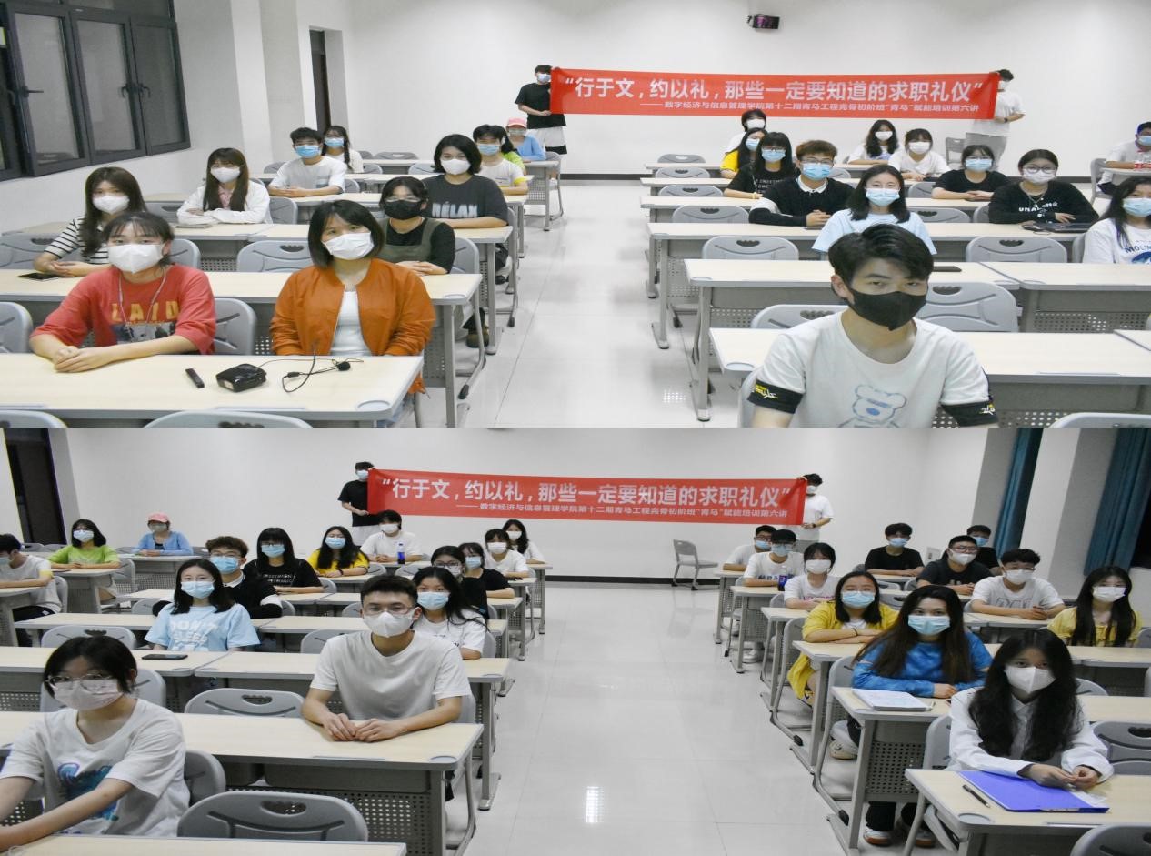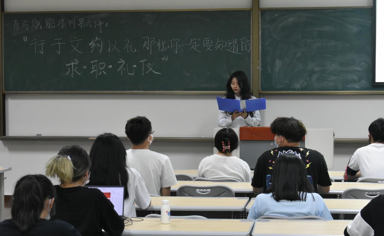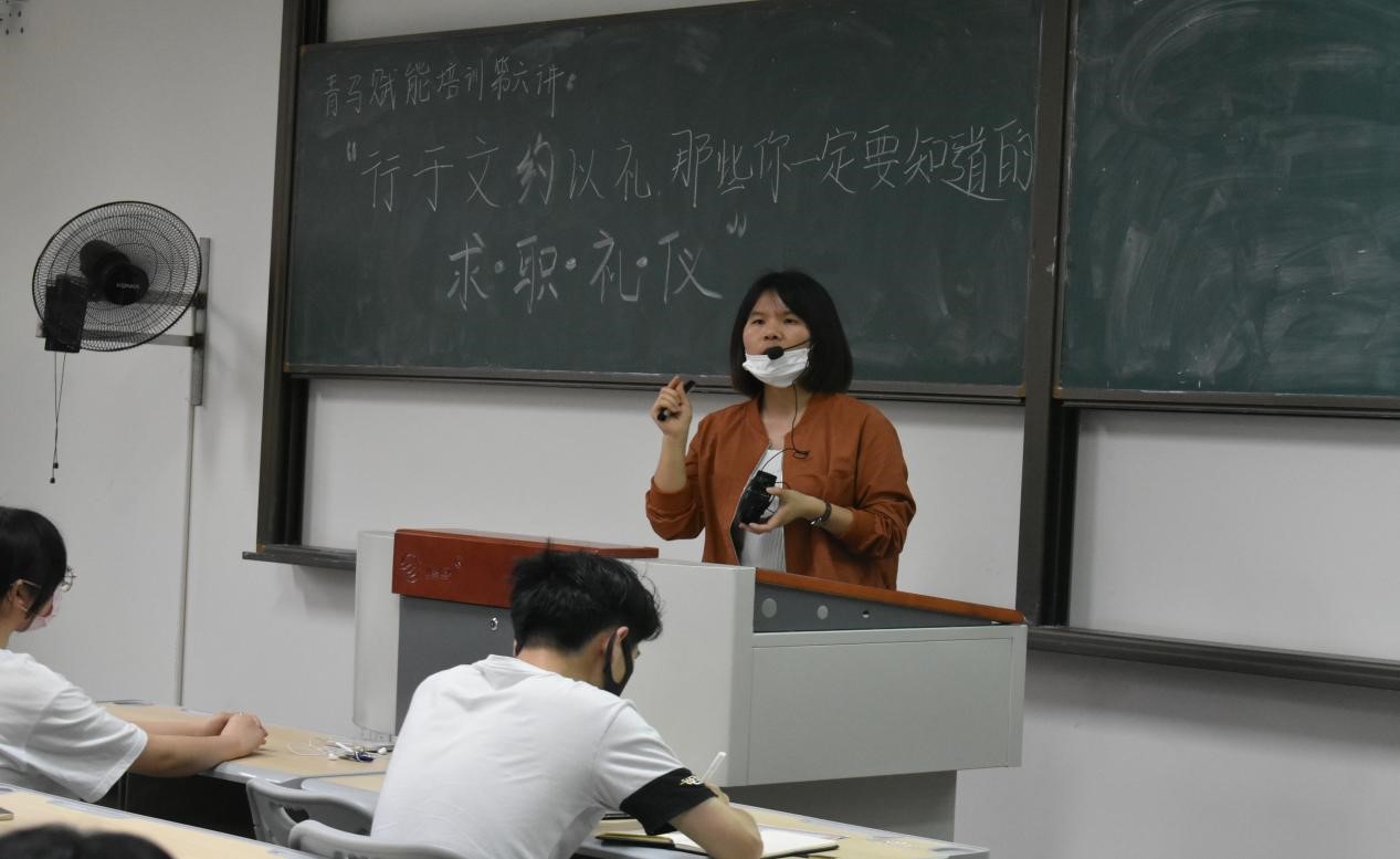 习近平总书记指出:“礼仪是宣示价值观、教化人民的有效方式”。不学礼,无以立,良好的生活规范和个人礼仪是待人接物的重要准则之一。为深层次推动我院青马学员礼仪规范意识,营造学礼仪、知礼仪、习礼仪的良好氛围,我院于4月11日19:00在双栀304教室举办“行于文,约以礼,那些一定要知道的求职礼仪”第十二期青马工程完骨初阶班“青马”赋能培训第六讲。本讲有幸邀请到数字经济与信息管理学院副院长任瑞娟老师担任主讲嘉宾。