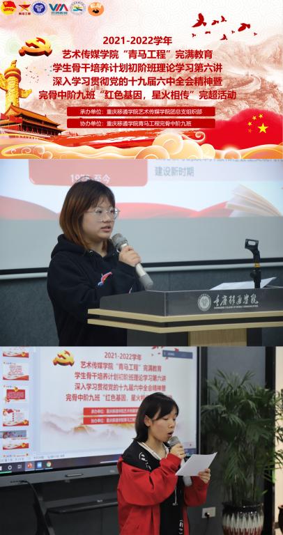 2022年是党的二十大召开之年。为营造喜迎二十大的浓厚氛围,2022年4月8日重庆移通学院青马工程完满教育学生骨干培养计划中阶九班携手艺术传媒学院第四期青马工程完满教育学生骨干培养计划初阶班在南湖书院举行了理论学习第六讲深入学习贯彻党的十九届六中全会暨“红色基因,星火相传”完超活动。