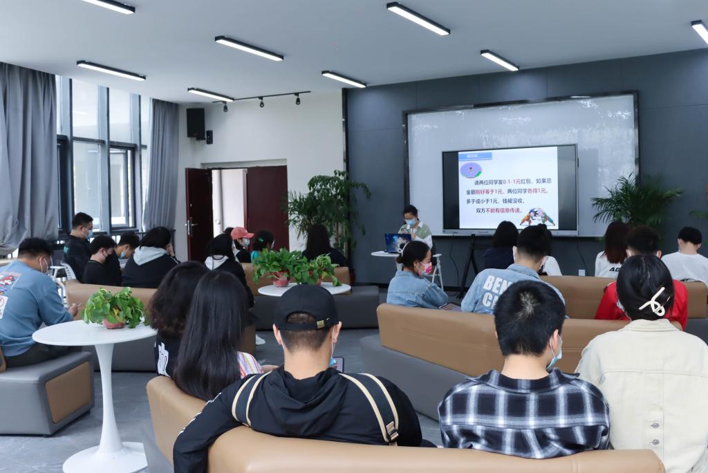 在互动环节中,冯老师以游戏互动的形式将“博弈”二字体现的淋漓尽致,在第两个环节中,“两位同学分别以0.1-1元红包、5元红包为操作基础进行规则改变,前期如果总金额刚好等于1元,两位同学各得1元,多于或小于1元,钱被没收,双方不可沟通交流;后期以5元红包注明“退”或是“进”;都进,钱没收,都退,各返5元,一进一退,进返15元,退返5元;大家合作共事,大多数同学保守起见,都选择了“退”,双方各返5元。”在既定的游戏规则下,零交流、零沟通,独立的思考,以新的商科思维在既定规则下进行融会贯通,充分说明思维及策略的重要性。