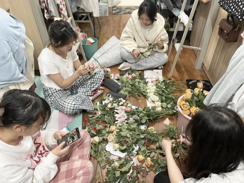3月24日晚上,21122107团支部同学一同在宿舍进行手工制作,修剪玫瑰。每位女孩子都在用自己的双手,一朵一朵为玫瑰去除杂乱的刺、多余的叶、有枯萎迹象的瓣。她们希望那些可爱的人收到的是一朵充满爱意、状态饱满的玫瑰。她们用心制作,每朵玫瑰的背后都是同学们对浪漫的理解。手工时长持续到晚上十一点,她们脸上始终挂着笑,手中的一朵又一朵玫瑰都被她们赋予了满满的期望和爱。