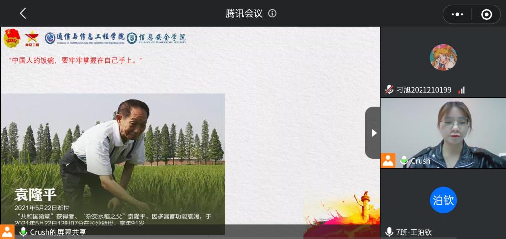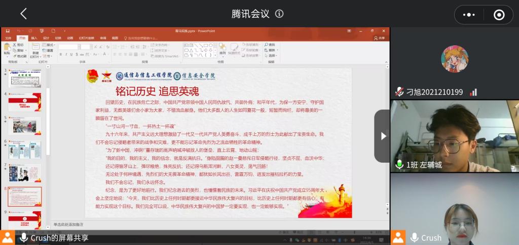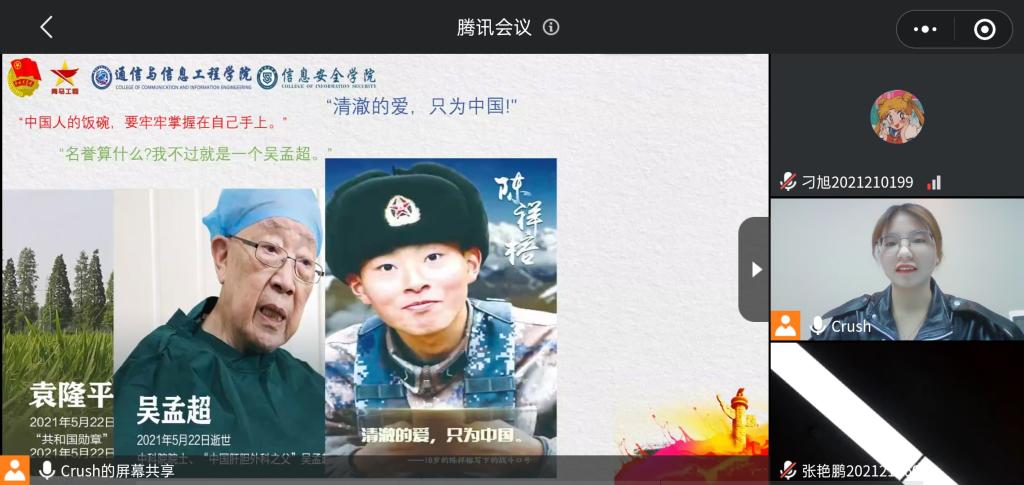英雄是国家历史的重要体现,是民族精神的重要来源。每一方纪念碑,每一座烈士墓,每一段英雄故事,都是永不熄灭的精神火炬,赋予我们强大的精神力量。值此清明之际,通信、信安学院于2022年4月5日星期二14:30在腾讯会议开展了青马工程第四期“铭记革命英雄,传承红色精神”实践课。