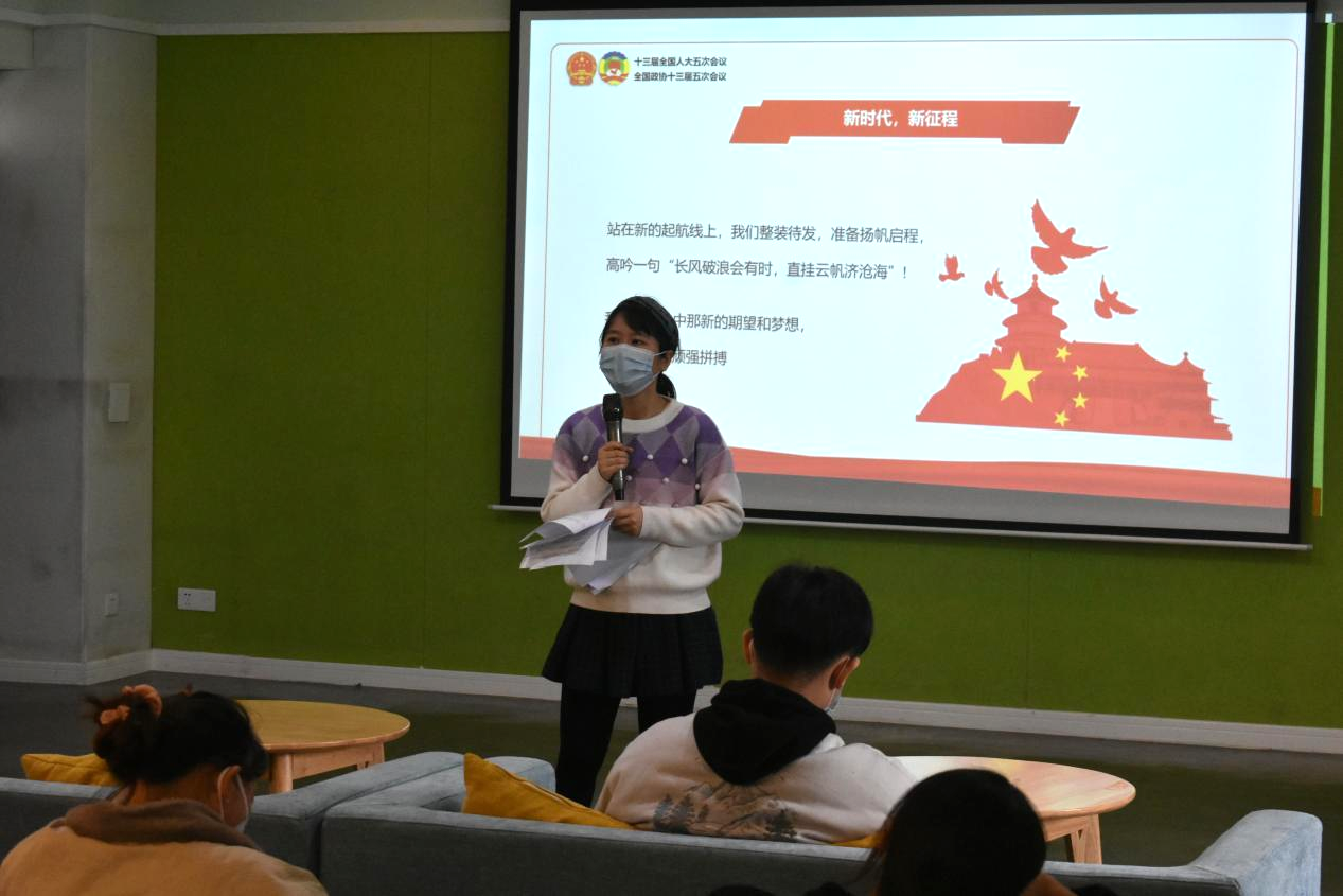 新征程奋辑扬帆,九万里风鹏正举。马莉老师带领大家解读两会精神并做出活动总结,今年两会精神内容要点概括主要包括三个方面,一是习近平总书记参加团组活动重要讲话;二是政府工作报告;三是代表委员重要议案提案。而今年代表委员提案最受关注的就是民生问题,包括养老金上涨、延迟退休、婚育、女性权益、法律法规、教育、防疫、网络等,明确指出大家应关注时政,结合我校完满教育,为自己心中的梦想而努力拼搏。我们新时代青年站在新起点上,理应抓住机遇,加速创新,以功成不必在我,功成必定有我的担当,争做德智体美劳全面发展的社会主义建设者和接班人。