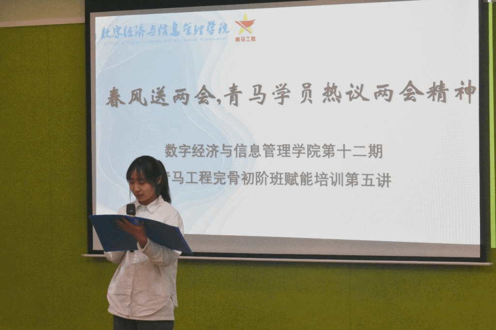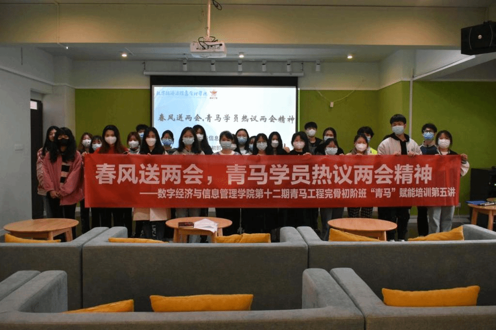 寒雪梅中尽,春风柳上归。全国两会对于国家发展具有重要意义,为深入学习两会精神,培养“时代新青马”的正确是非观,我院于4月1日15:00在双栀书院多功能影音室举办“春风送两会,青马学员热议两会精神”第十二期青马工程完骨初阶班“青马”赋能培训第五讲。本次培训有幸邀请到数字经济与信息管理学院团总支书记马莉老师带领学员共同感受“两会精神”。