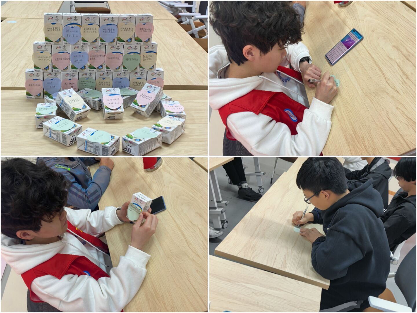 在团支书和班委的组织协调下,在全体成员的共同努力下,本次爱心送暖活动正式拉开序幕。按照团支书的分组,同学们积极配合一起制作爱心贴纸,“疫情不隔爱,温暖一直在”,“疫情之下,你我同在”,等许许多多的暖心话语写满了爱心贴纸,这些爱心话语正是同学们想对此次疫情封校中默默奉献工作人员的祝福与感谢。正是因为这些工作人员的默默付出和守护,疫情期间同学们才能正常的学习和生活。随着爱心贴纸的制作完成,同学们一起将制作好的爱心贴纸贴在牛奶上,将自己的祝福语感谢贴于牛奶上,并将牛奶摆成了爱心的形状。