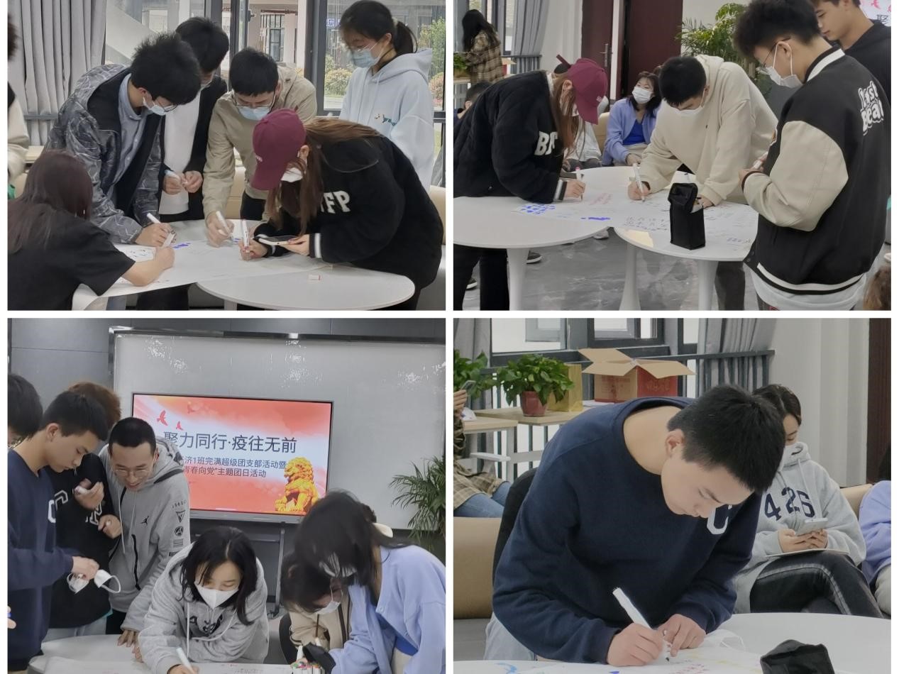 在共青团改革的大背景下,为加快班团一体化的进程,激发基层团支部活力,旨在着力提升团支部的自身建设,建立特色团支部。2021级数字经济01团支部积极响应号召,在疫情防控特殊阶段选择“活力团支部”类型,从行动上、表达上、思想上三大环节入手,于2022年3月24日下午15:30在南湖书院中德创意工坊开展本学期完满超级团支部活动。抗时疫、调心态、聚能量,展现青年人独有的蓬勃朝气,不断朝着完满奋进。