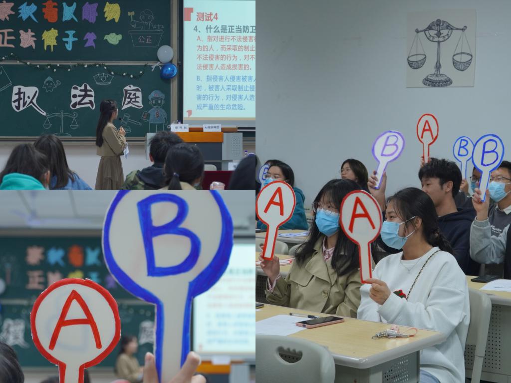 同学们有序通过安检,领取旁听证、意见表后,入步“法庭”现场落座,严格遵循法庭秩序。映入眼帘的便是年级会精心准备的答案牌,随后年级会正式开始,首先抛出了几个我们身边常见的法律问题,“你认为什么行为属于校园霸凌?”“面对校园霸凌时你会怎么选择?”“当你属于被害者时该怎样进行正当防卫?”“什么是正当防卫?”……伴随着一个个问题的出现,同学们思考片刻后手中的答案牌也一次次举起落下。潜移默化之中,一颗关于“法”的种子便在同学们心中悄然种下。