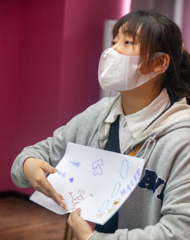 活动接近尾声,最后一个活动项目便是“爱传递”,他们满怀热情地谈到了参与本次活动的内心感受,无论是言语词符的表达,还是面部表情的流露,都展现出大家对于本次活动的热情与喜悦。大家在活动项目中展示了自己小组合作的成果,“轻松愉悦”、“真诚用心”、“心满意足”和“齐心协力”都是大家对于本次活动最真实的感受。