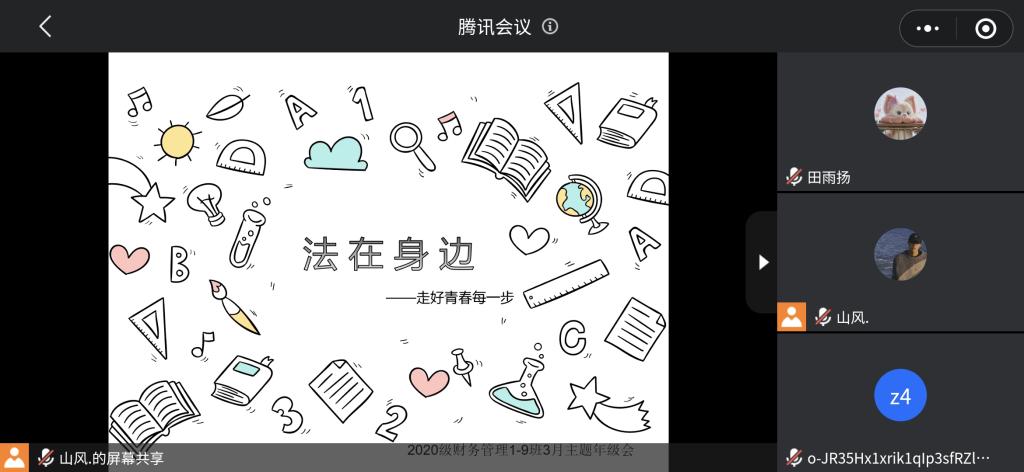 为了让学生了解《宪法》,认识《宪法》,懂得用法律的武器保护自己的合法权益,并且培育学生国家意识、法治意识、社会责任意识。2020级财务管理1-9班于2022年3月23日下午通过线上会议的方式开展“法在身边·走好青春每一步”为主题的年级会。