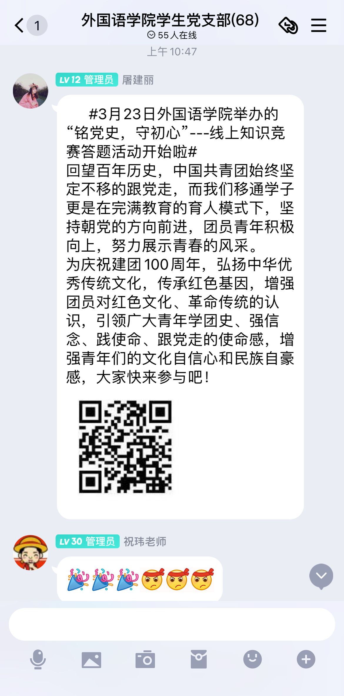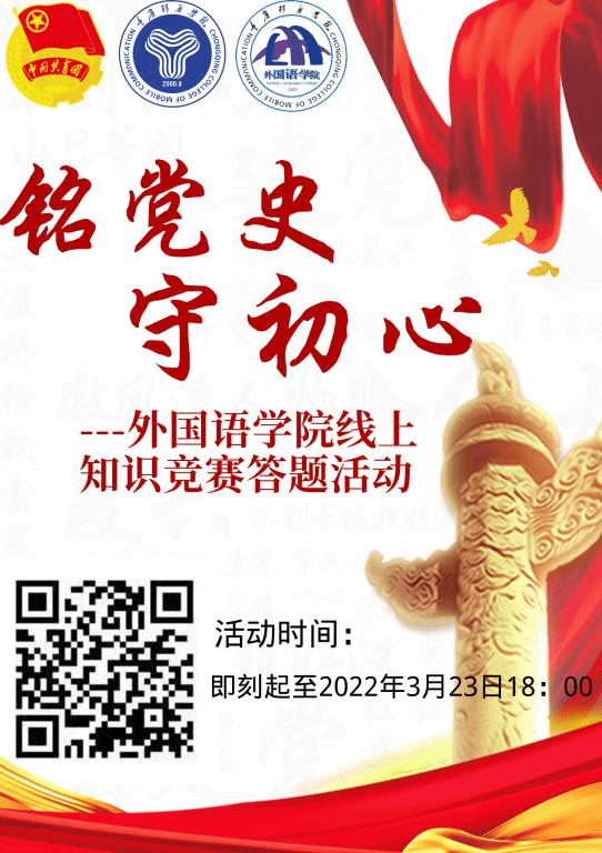 为传承红色基因,牢记党的初心和使命,共续党的精神命脉,加强对党精神的深入了解,同时让同学们能通过党史学习,领会党的光辉历程,将党的精神实践到学习中。因此外国语学院于2022年3月23日举办“铭党史,守初心”---外国语学院线上知识竞赛答题活并邀请全体团干部及青马工程初阶班全体成员共同参与。