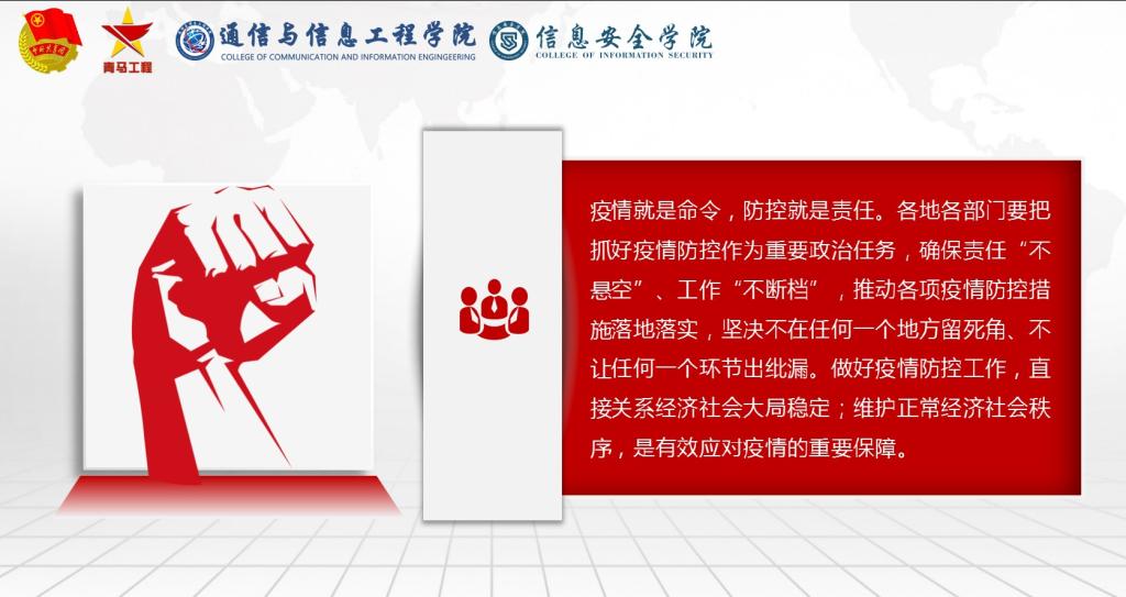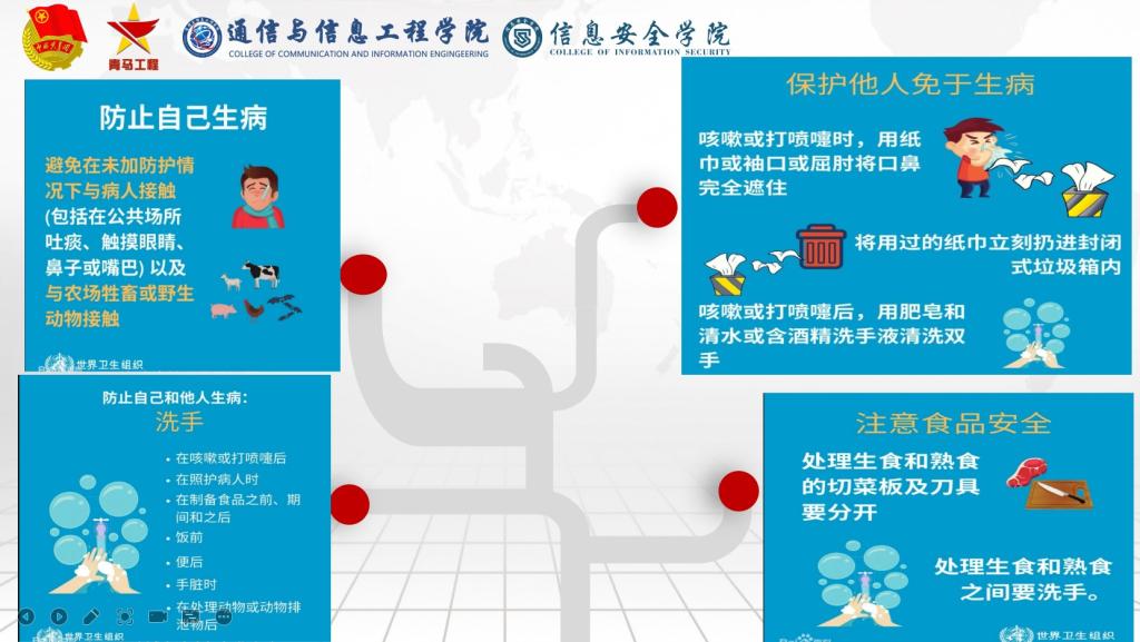 伴随疫情形势再度严峻,抗击疫情刻不容缓。3月19日下午14:00,为使我校学子了解疫情防护知识,做好疫情防护准备,通信、信安学院青马工程“同舟共济,共同抗疫”主题实践课于线上准时开展。此次实践课由尹江波同学主持,共计150余名同学线上参与。