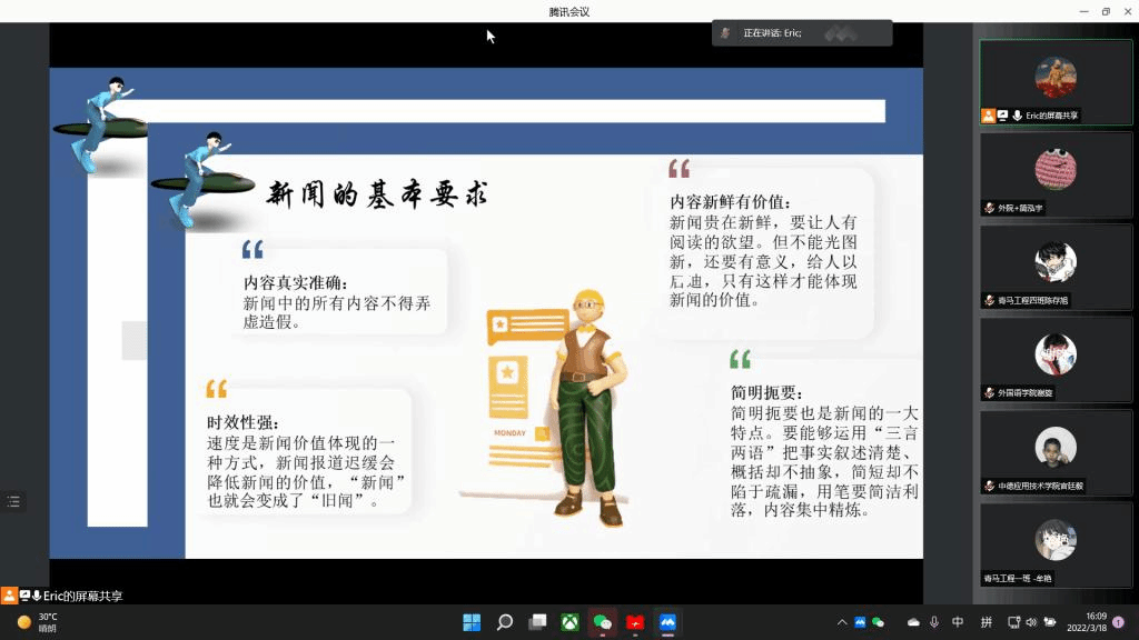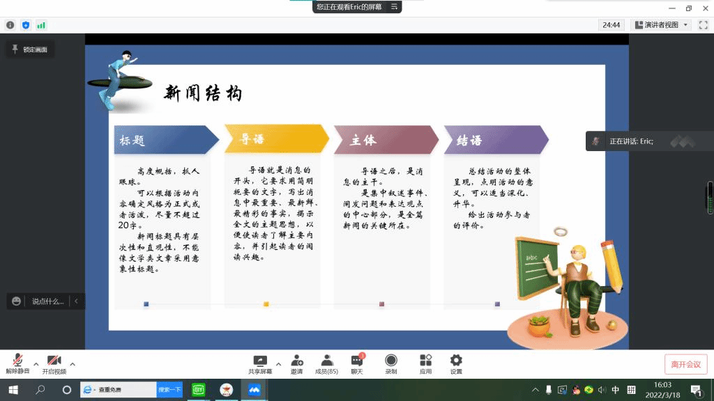 为近一步提高学生宣传素养,调动学生对宣传建设的积极性。外国语学院联合中德应用技术学院于2022年3月18日16:00开展“提高新闻宣传意识,提升采编技能”新闻稿培训会。此次培训会对象是外国语学院与中德应用技术学院青马工程初阶班及外国语学院完满观察团全体成员。应疫情防控工作要求,本次培训采用线上会议的形式,由南湖书院发展导师杨潇老师为学员们讲解如何写好一篇新闻稿。