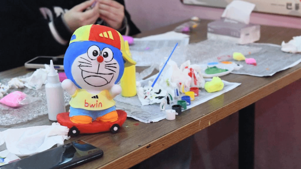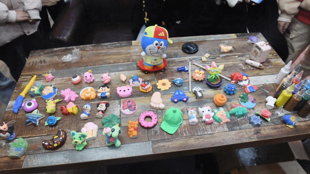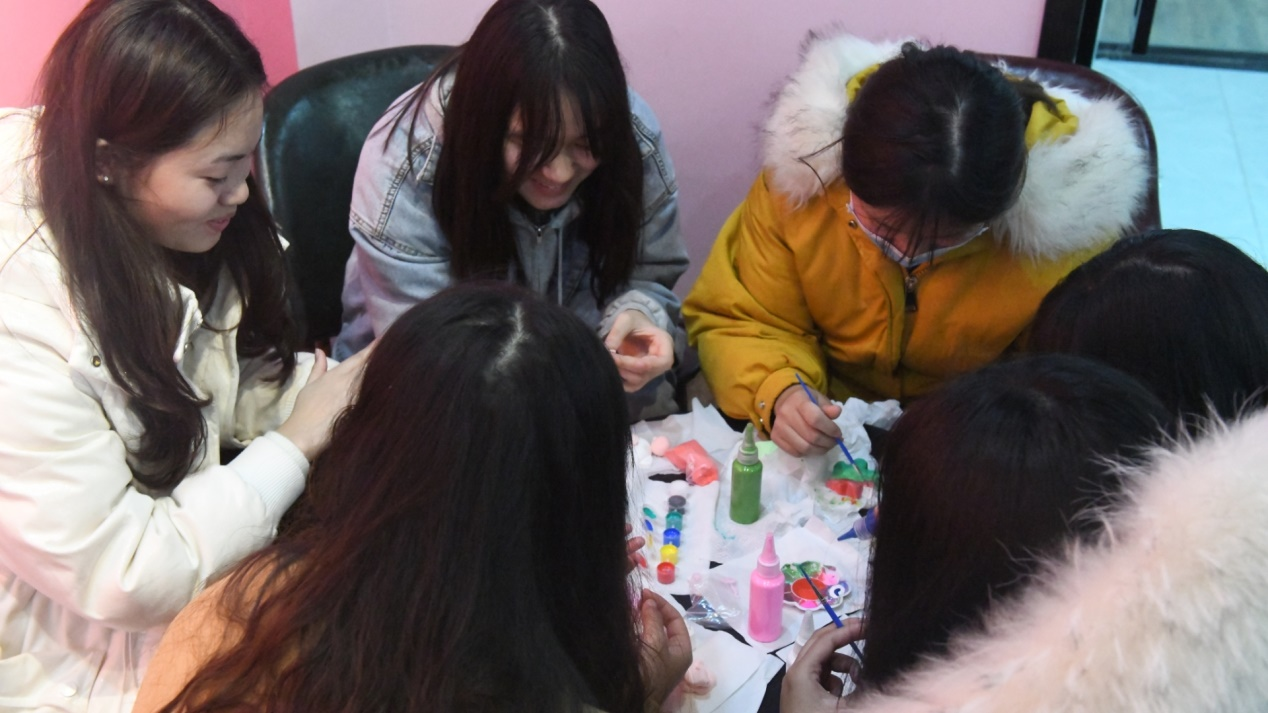此次的完超活动,我们提前准备了关于手工的颜料,粘土模型与模具、石膏等。我们每六人组成小队,组长通过猜拳决定顺序,公平公正,挑选出组员喜爱的颜料,模具等等,各自小组分工完成手工小任务,并挑选出最受欢迎的送给我们的辅导员老师与班导师等前辈。同学们也可以将这些小挂件赠送给亲人、朋友、对象等。我们对手工的了解也许是用它来传递我们班级的爱意,也表现出我们班级对手工的喜爱,更符合我们的班级完超的主题。