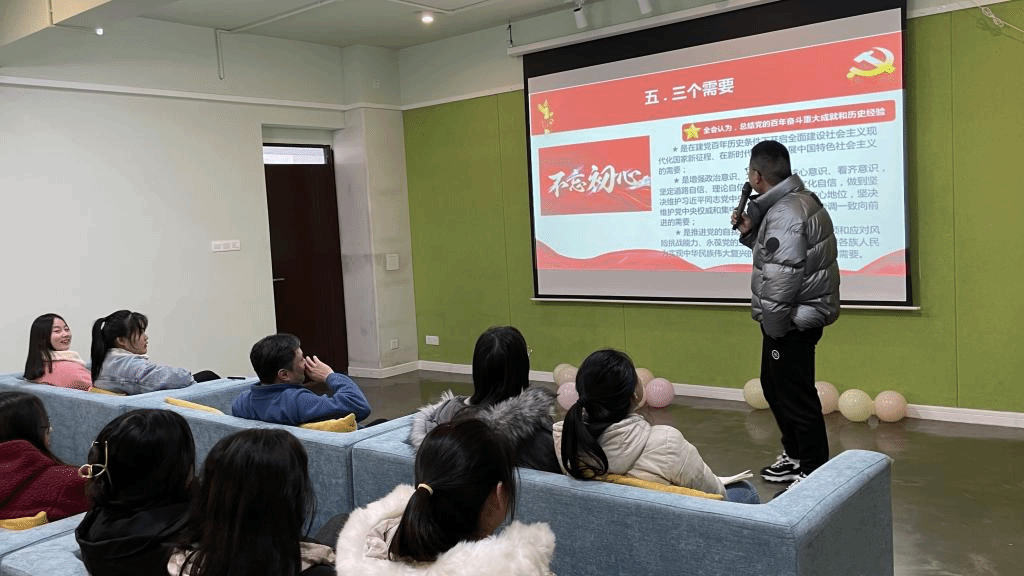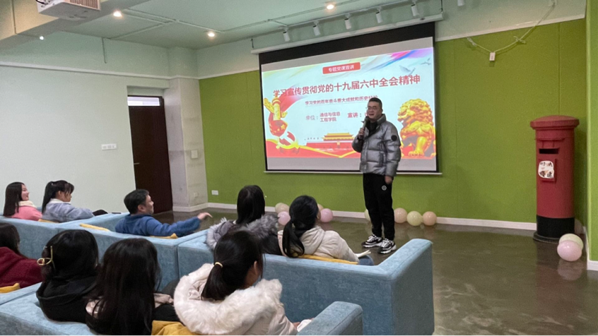 党的十九届六中全会全面总结党的百年奋斗重大成就和历史经验,深刻揭示过去我们为什么能够成功、未来我们怎样才能继续成功,对推动全党进一步统一思想、统一意志、统一行动,团结带领全国各族人民夺取新时代中国特色社会主义伟大胜利,具有重大现实意义和深远历史意义。为深入学习贯彻党的十九届六中全会精神,推动全会精神深入学生群体,2021年12月21日,通信与信息工程学院宣讲小分队成员苟凡铖老师在双栀多功能影音室为我院学生进行宣讲。