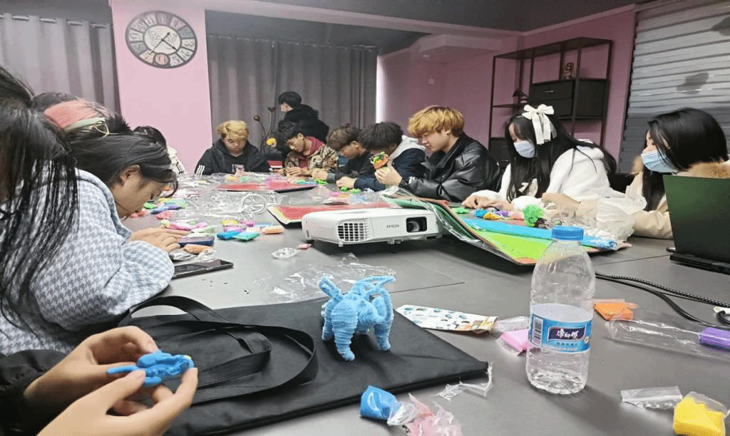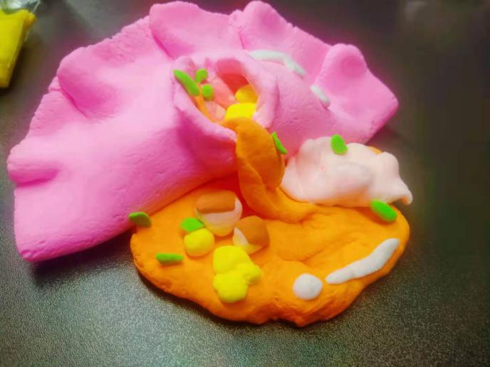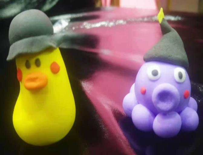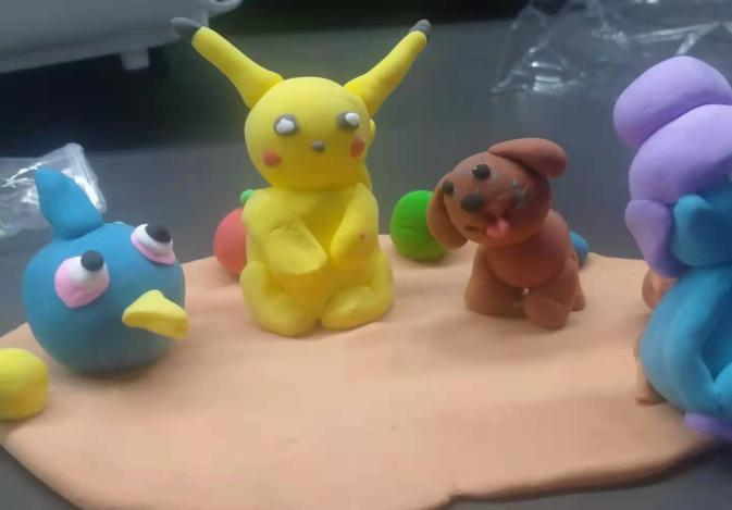 在这么一段并不算长的制作时间里,所有同学都沉浸其中,只不时听见借工具或材料的声音,邦邦的敲桌声,是记忆深处擀面杖的动静,黏土在手上的按压和搓圆,是骨子里的记忆.最后,同学们展示着作品,分享着自己的独特想法,十分热闹惬意.