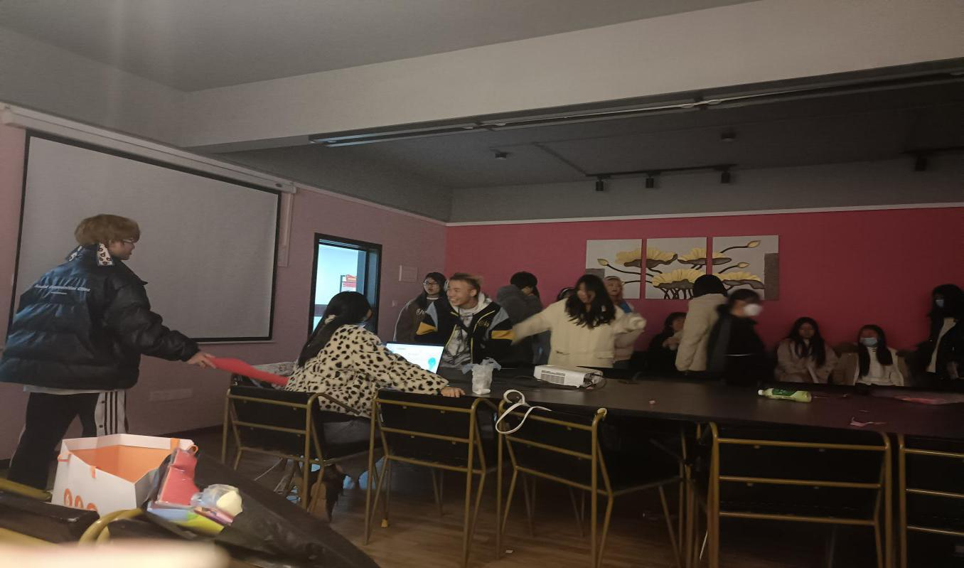 第二个小游戏,盲人抓人,用击鼓传花的游戏来决定盲人,盲人抓到的那个人要回答关于立冬的习俗或者吃饺子用到的材料。大家跟随音乐的旋律慢慢动了起来,在欢声笑语中,同学们通过互动,促进了之间的感情,不再拘束。