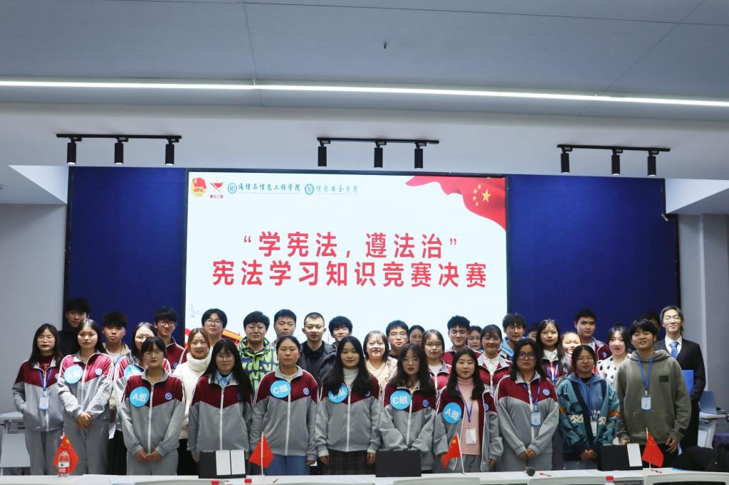 世界上唯有两样东西能让我们内心受到深深的震撼,一是我们头顶上的灿烂星空,一是我们内心崇高的道德法则。为了提高学生的法律意识,完善学生的社会责任意识,2021年12月17日12:30-17:30通信与信息工程、信息安全学院在綦河书院多功能厅开展“学宪法,遵法制”知识竞赛初赛以及决赛活动。参与本次活动的嘉宾有校团委龙凤老师、学生处温宗航老师、信息安全学院辅导员王辅崇老师、通信与信息工程学院辅导员田海燕老师以及“青马工程”完骨班初阶班全体成员。经过预赛的层层选拔,最终4个班级优秀学生代表出战决赛。