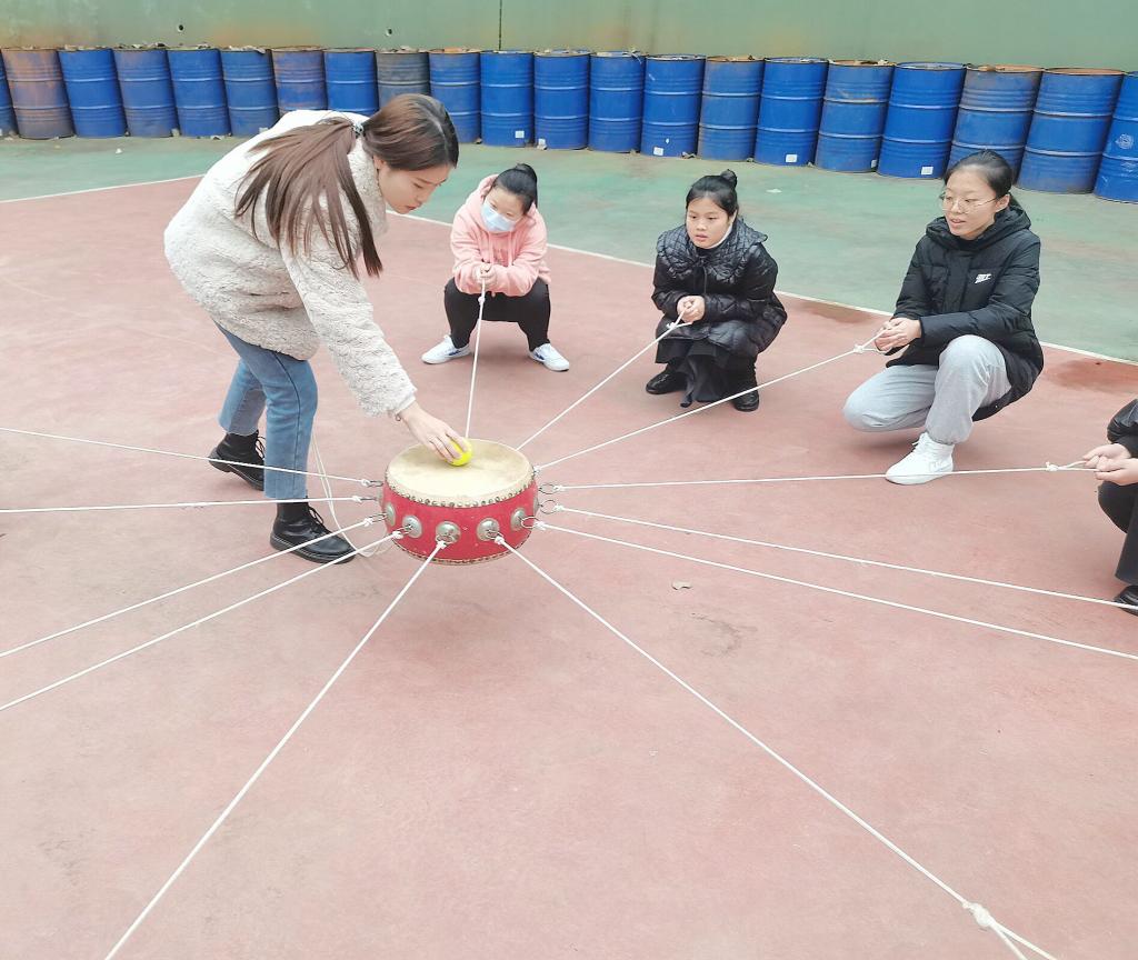 “击鼓颠球”——一组的每个人都需要拉着鼓的周围的所有绳子,并使鼓面上的网球颠起来时不超过20厘米。一个人做简单的事时或许是很容易完成的,但多个人做一件事的话,或许就会变得难以完成。这恰恰是考验大家团队合作的能力。团结协作是成功的基础,个人和集体只有依靠团结的力量,目标才能得以实现。一个缺乏合作精神的人,不仅事业上难有建树,很难适应时代发展的需要,也难在激烈的竞争中立于不败之地。越是单枪匹马,往往越难取得成功,越需要团结协作,形成合力。