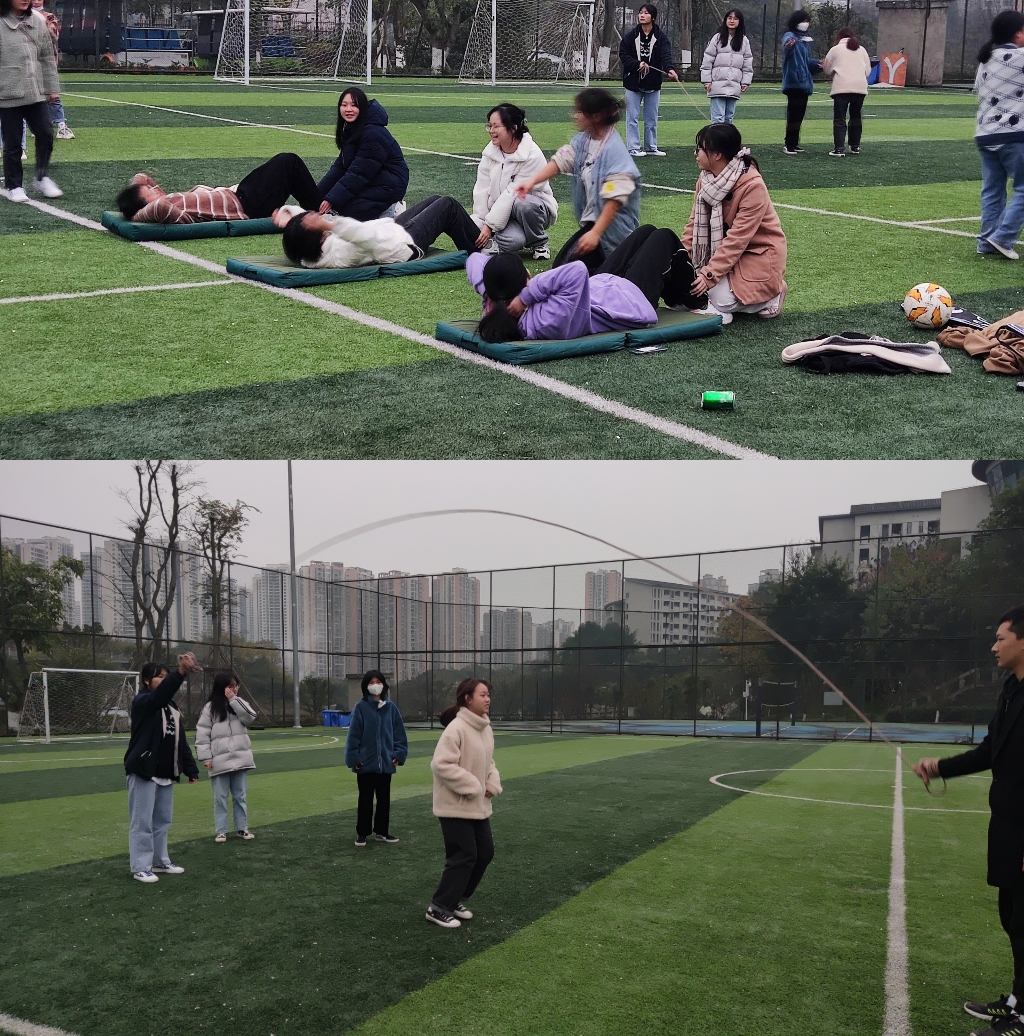游戏三人组队,在50米赛跑、15个仰卧起坐与10个大绳三个项目中用时最短队伍获胜。同学们踊跃报名参加,队伍众多。剩下的同学也没有闲着,纷纷当起啦啦队员为大家加油打气,参赛人员动力高涨,活动现场气氛火热,再一次让同学们感受到运动的快乐。