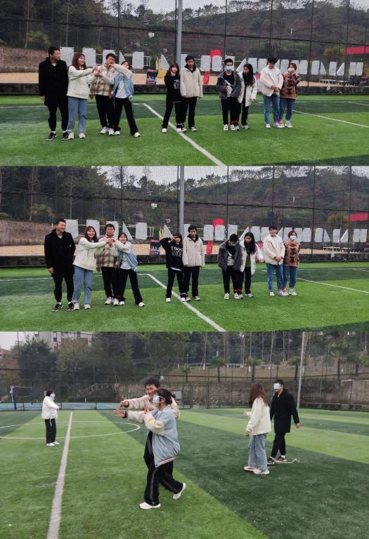 游戏中男女组合参加。50米两人三足彰显男女生间的默契配合;信任是人与人之间相处的重要桥梁,一位队员蒙住眼睛,由另一位队友指挥其走向10米外的工作人员击掌即为胜利。因只有五名男生,所以选取了五组队伍进行挑战,总会有同学偏离正确的“航线”,其间欢笑声不断,大家都乐在其中。