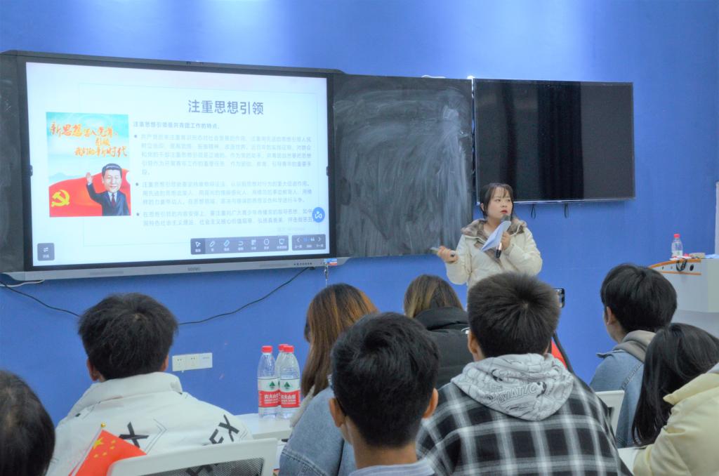 高校共青团是共青团组织的一个重要组成部分,是高等院校先进青年学生的群团组织,对大学生团员而言,了解高校共青团的工作原则可以明白高校共青团工作开展的依据,理清高校共青团的组织结构,熟悉团支部的组织生活规定可以充分融入团组织。田海燕老师以建党100周年为背景,通过对我党百年来艰苦奋斗历程,荆棘与光辉的道路,从最初的星星之火到现在的燎原之势,发展至今的党组织,来引入了和我们大学生息息相关的共青团组织,围绕着共青团在高校组织开展工作和生活展开了一系列的讲解。