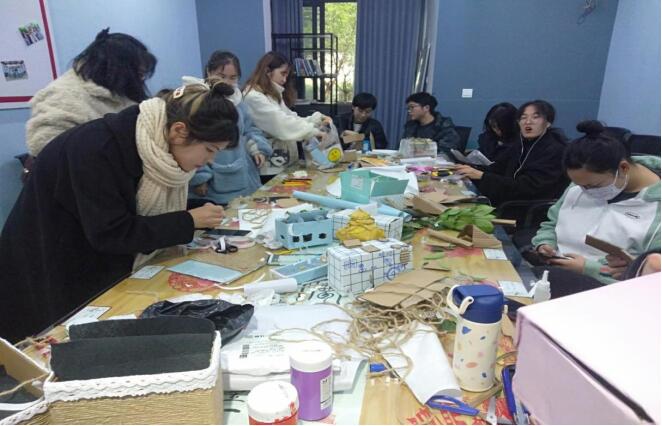 12月8日中午12点,21122107支部全体同学到达北山书院坚韧会议室进行手工制作,捏粘土,对快递纸箱、麻绳、矿泉水瓶等生活中常见废旧物的二次利用,以环保的方式去制作一些小巧精美的手工品。每位同学都在用心制作,每件作品的背后都是同学们对洛阳溪社区里的孩子们的关心。制作时长持续到下午五点,同学们手中的一件件作品都被他们赋予了满满的期望与爱。