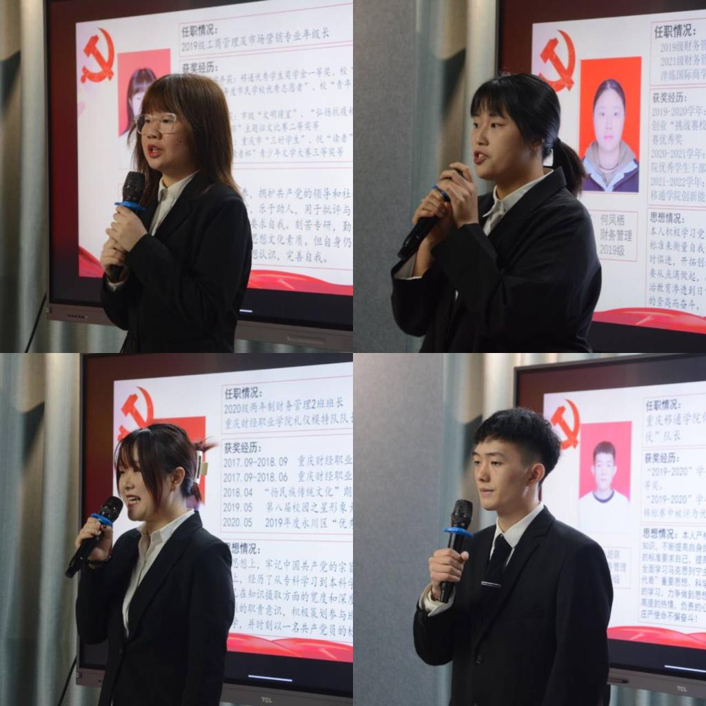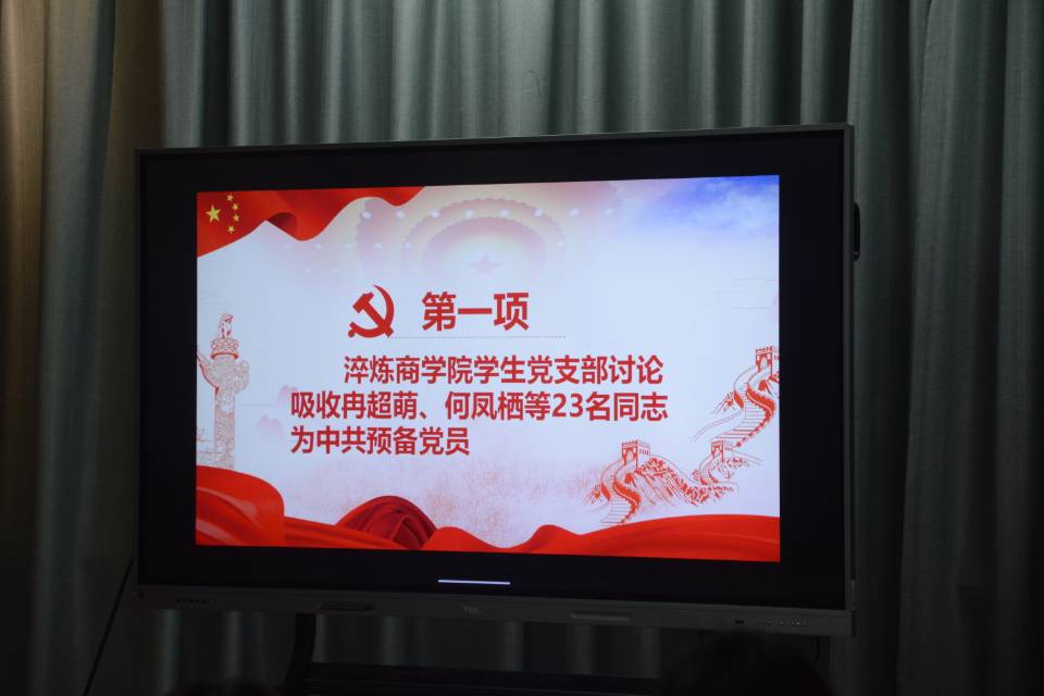 大会由淬炼商学院党建版块指导老师王玉勤主持,本次会议严格按照组织流程,经上级党组织批准,召开此次关于讨论是否接收冉超萌等23名同志为中共预备党员的支部大会。会前,大会通过了由谢家丽同志和张露月同志担任计票人、杨子潇同志和邓弘鹏同志担任监票人的提议。大会开始,冉超萌等23名发展对象依次上台,从对党的认识、入党动机、本人履历和近期现实表现等情况进行简要汇报。