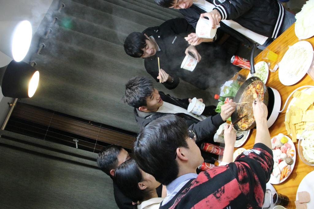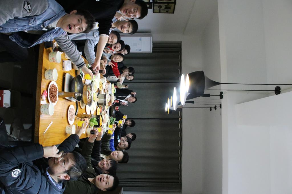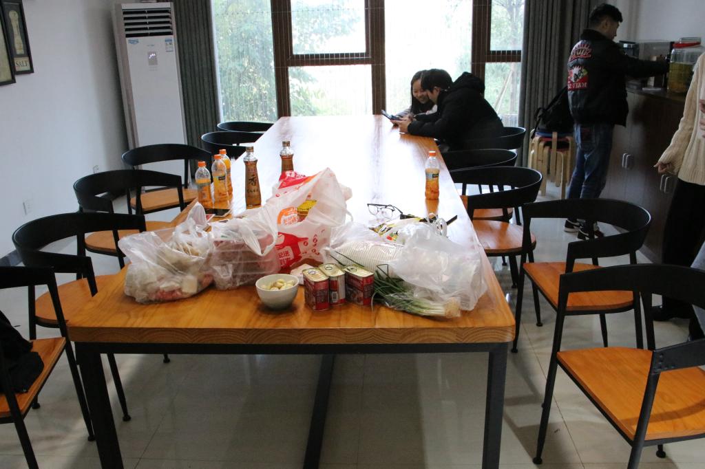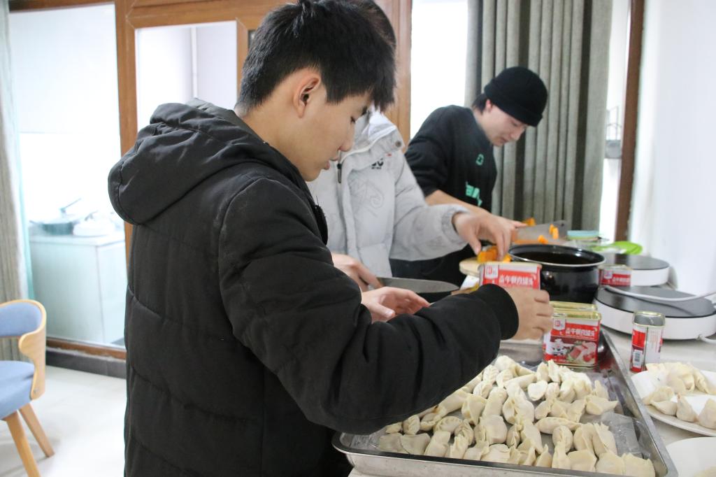 经过数个时辰的等待,满载而归的采购小分队带着自己的战利品准时到达了战场。收拾好菜品,分坐在小桌旁,伴着美妙的音乐大家包起了饺子!有的是第一次包饺子,逗得大家嘻哈打笑,在这样的欢快雀跃的氛围中为接下来的烹饪组做好准备工作。班里人才济济,大厨比比皆是,烹饪的同学到来时,菜品的准备工序已经在大家的努力下共同完成了。这时只需他们掌勺便可出锅一道道美味佳肴。在大家期待的眼光中,飘香的佳肴被端上来餐桌。各方落座,共同举杯合影留恋。这时天色渐晚,在温暖灯光的照耀下,在热气腾腾的佳肴里,在欢快悦耳的音乐里,和谐可亲的氛围下,同学们热火朝天的说着当下或曾经的趣事。