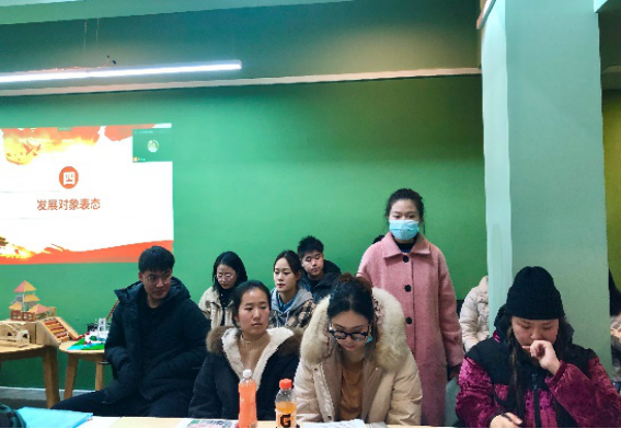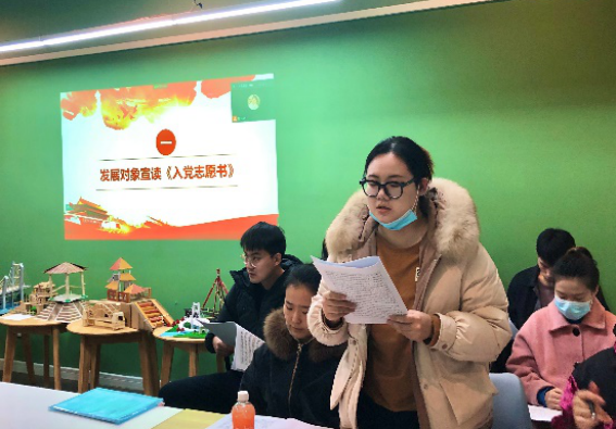 会议由八个流程进行:发展对象宣读《入党志愿书》、入党介绍人介绍发展对象有关情况、支委会报告对发展对象的审查情况、发展对象表态、与会党员就发展对象入党问题进行充分讨论、无记名投票、党旗宣誓、支部书记任瑞娟老师讲话。
