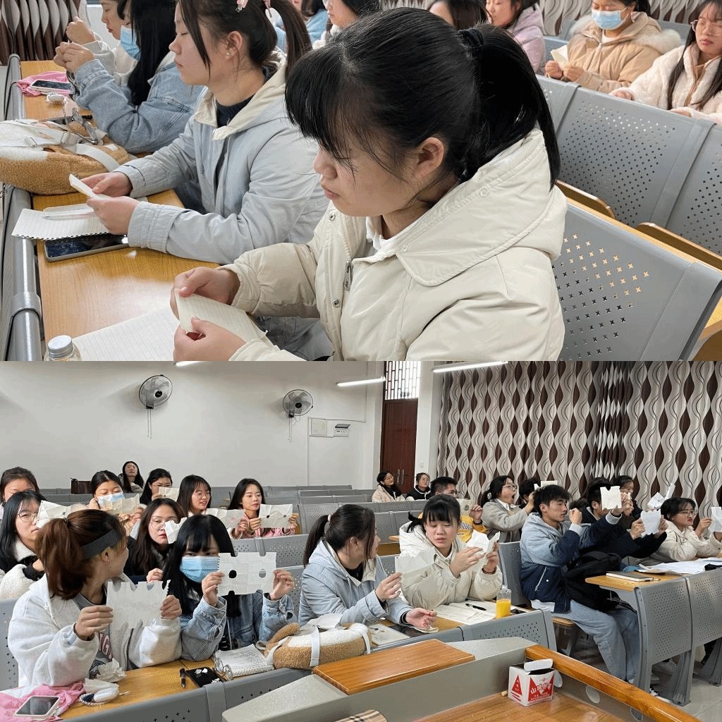 情商对于人的发展具有重要的意义,曾老师用一个坐标图讲述情商的作用,告诉学员们,一个完满的人应是智商情商双双在线的。两者相辅相成,缺一不可。紧接着曾老师带着学员们做心理测试小游戏,让学员们拿出一张纸闭着眼睛对折几次,并撕下一个角,然后展开,睁开眼睛后,让学员们对比自己手上的纸与身边同学的纸有什么不同。学员们发现展开后所撕图纸各不相同。从侧面反映出每个人都是独一无二的,这也让学员们更加相信自己的与众不同,并体验到思考和情商的魅力。