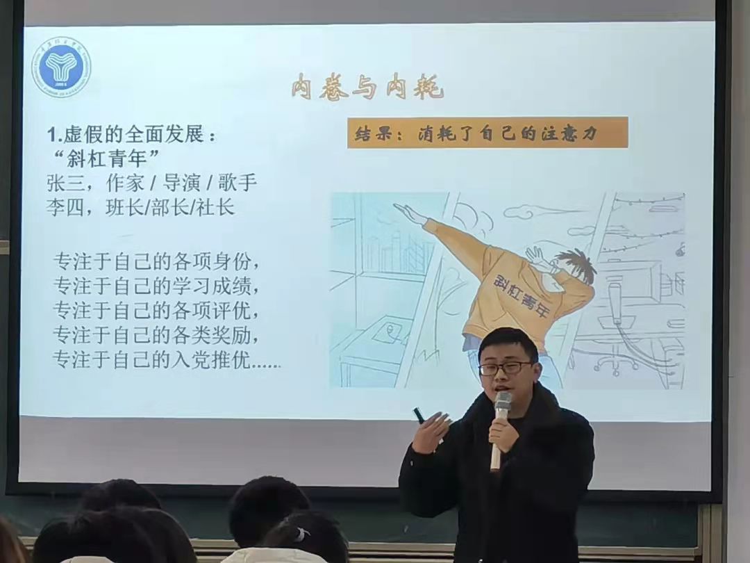 在课程进行中,李军院长以“大学生内卷, 我们应当如何破局”为主题,生动形象地围绕内卷与内耗、内卷与进取、内卷与躺平的三种不同关系来分析、刨析、阐释内卷的实质性内涵,并且从方法论的角度创新性的提出了“望、闻、问、切”四种良药来根除这个困扰当代大学生的“内卷”之症,从而“走出内卷,破局新生”。通过李院长授课内容,使刚刚踏进大学校门的大一新生更加深入地了解到何为“内卷”,懂得了如何从行动上提高办事、学习的效率,避免陷入做“无用功”的漩涡。