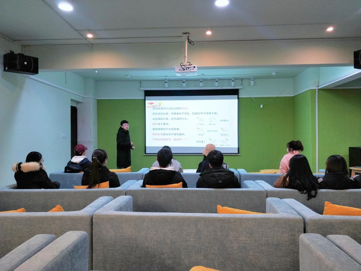 学习如春笋之苗,不见其长却日有所增。为落实“朋辈式”学习方式,促进学习“新圈层”理念发展,第十二期“青马工程”完满教育学生骨干培养计划中阶五班于11月29日下午18时在双栀书院多功能影音室准时开展十一月班级培训之“笔尖书华章,完满“新”起航”新闻稿摄影培训会。本次培训会由中阶五班班主任舒俊豪为17名班级成员详细讲解新闻稿以及摄影的相关内容。