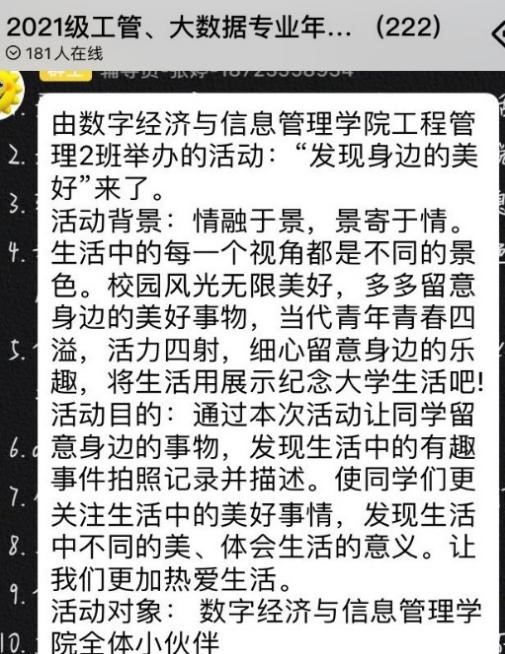 秋风萧瑟,层林染尽,一片金黄,阳光下,走在密林间别有一番滋味,我们在移通相遇,开始了新的征程。为了更好地丰富学生的课余生活,贯彻落实学校完满教育工作,促进学生的全面发展,发现身边的美好景色,2021年11月25日,2021级数信学院工程管理2班团支部组织了“发现身边的美好”的线上活动。