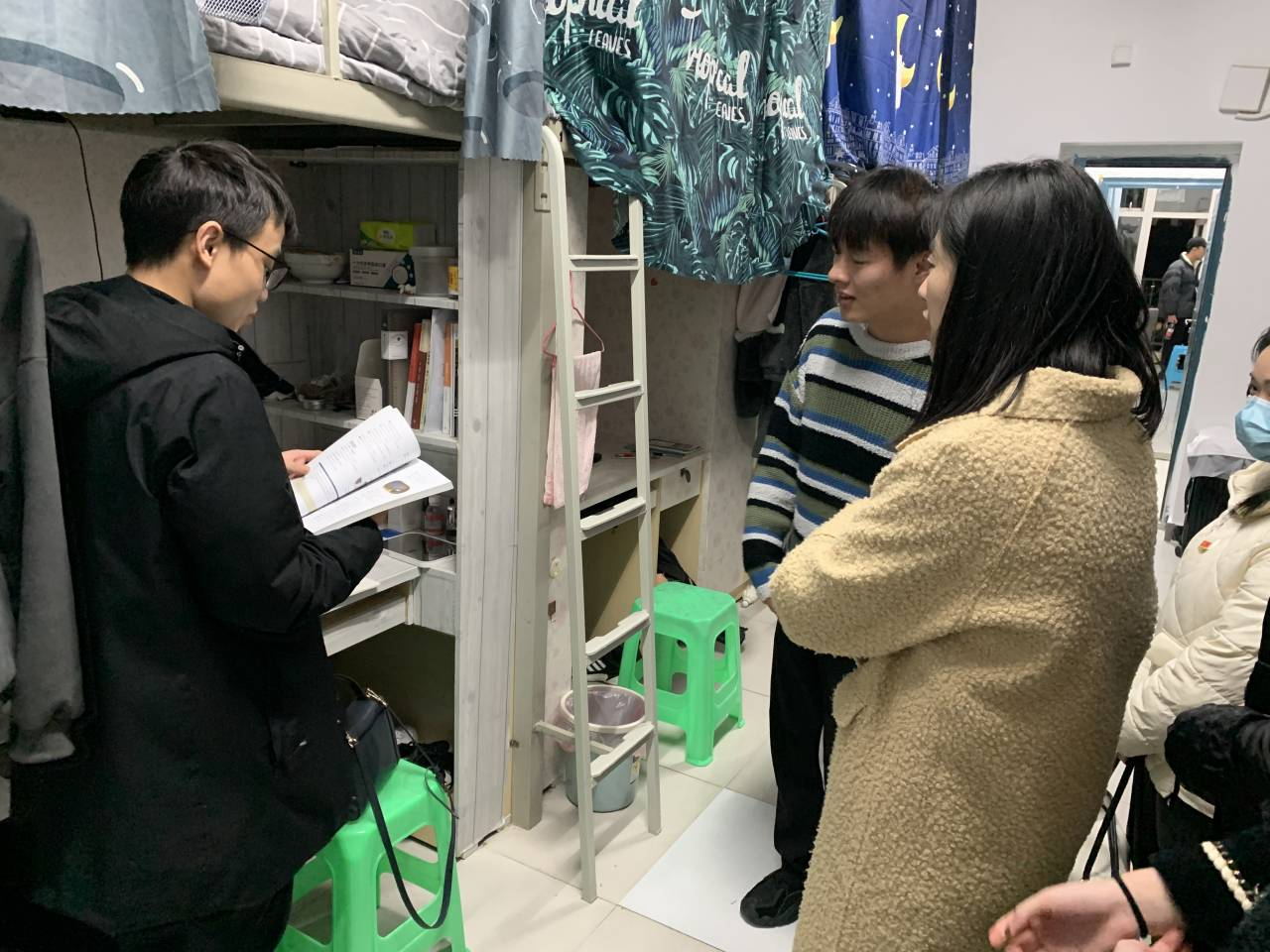 目前正值消防安全月,因此在走访过程中老师们重点关注和强调宿舍安全问题,了解同学们冬天的保暖措施。同时学生党员代表细心检查学生宿舍是否存在违规用电和使用大功率电器等危险物品,并向同学们普及一些防火逃生的办法,切实为同学们的安全保驾护航。当然,对于插线板悬挂于床头且没断电的情况,王老师给予了提醒并要求及时整改。