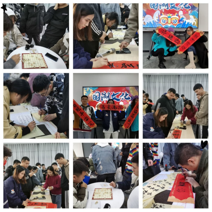 无论是民俗还是高雅,皆为我们优秀的传统文化。中华文化源远流长,博大精深,在璀璨的历史长河中,其中有一颗至今闪耀着的便是-中国象棋。两位同学围坐圆桌下着棋,很多同学都在旁边观看,气氛一片和谐融洽。汉字是中华民族几千年文化的瑰宝,它兼有象形、表音、表意功能,简单优美,内涵丰富。学习书法,可以提升国民的素质;写好书法,可以写出中华民族的审美。一部书法史和一部文化历史共衰共荣,历数千年而不变。书法兴则国运兴、文运兴。书法凝聚中国文化精神。写毛笔字,书写对联,在古老汉字的一笔一画当中,感悟具有美教化、厚人伦的巨大功效。