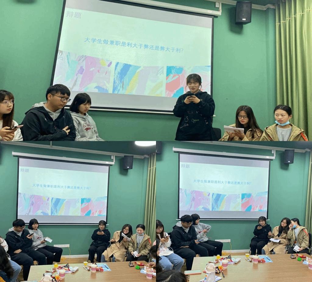 分享结束后,便是最令人激动的环节了——主题辩论赛。两支辩论队伍,以“大学生做兼职是利大于弊还是弊大于利”为主题展开激烈辩论。辩手们唇舌相争,你问我答,你攻我守,好似两军对阵一般,好不热烈。经过一场“没有硝烟的战争”后,辩论赛以正方队伍险胜告终。