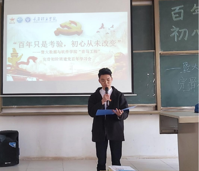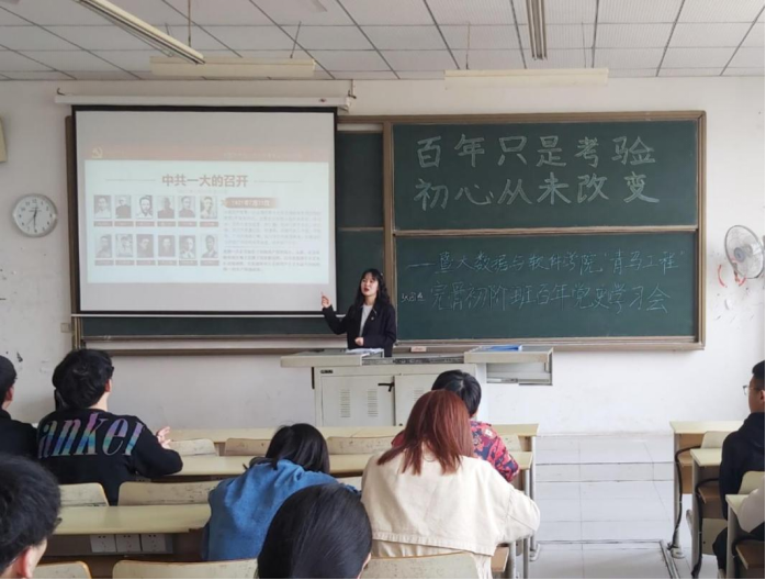 为深入学习贯彻习近平新时代中国特色社会主义思想,深化青马骨干思想引领,加强青年党史教育,着力提升我校“青马工程”完骨学员的理论素养。大数据与软件学院团总支组织部于2021年3月24日中午12:00在S3401举行“百年是考验,初心从未改变”青马工程完骨初阶班百年党史学习会。本次大会我们邀请到大数据与软件学院毕业于天津师范大学国外马克思主义研究专业的石静志老师讲解党史,进一步引导广大学员在学思践悟中进一步夯实理论基础,筑牢思想根基,努力成长为具有坚定马克思主义信仰、德才兼备、全面发展的青年政治骨干。
